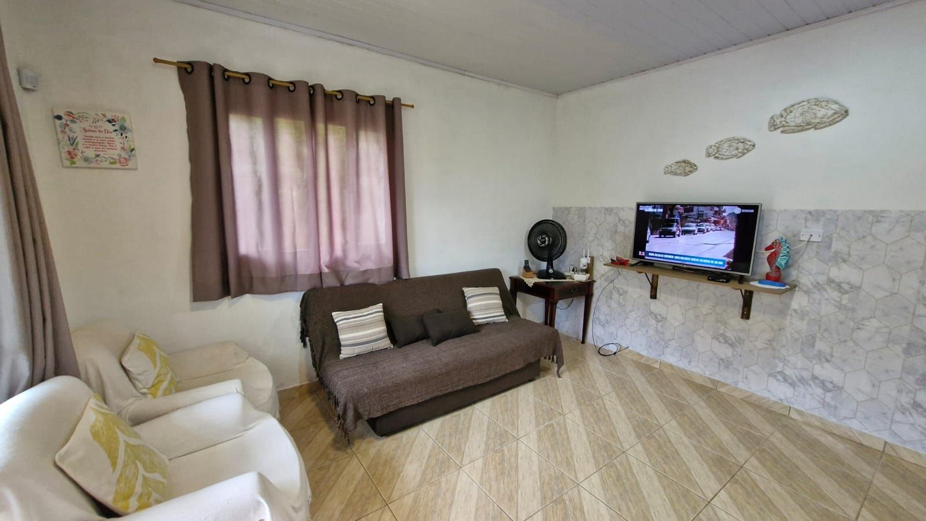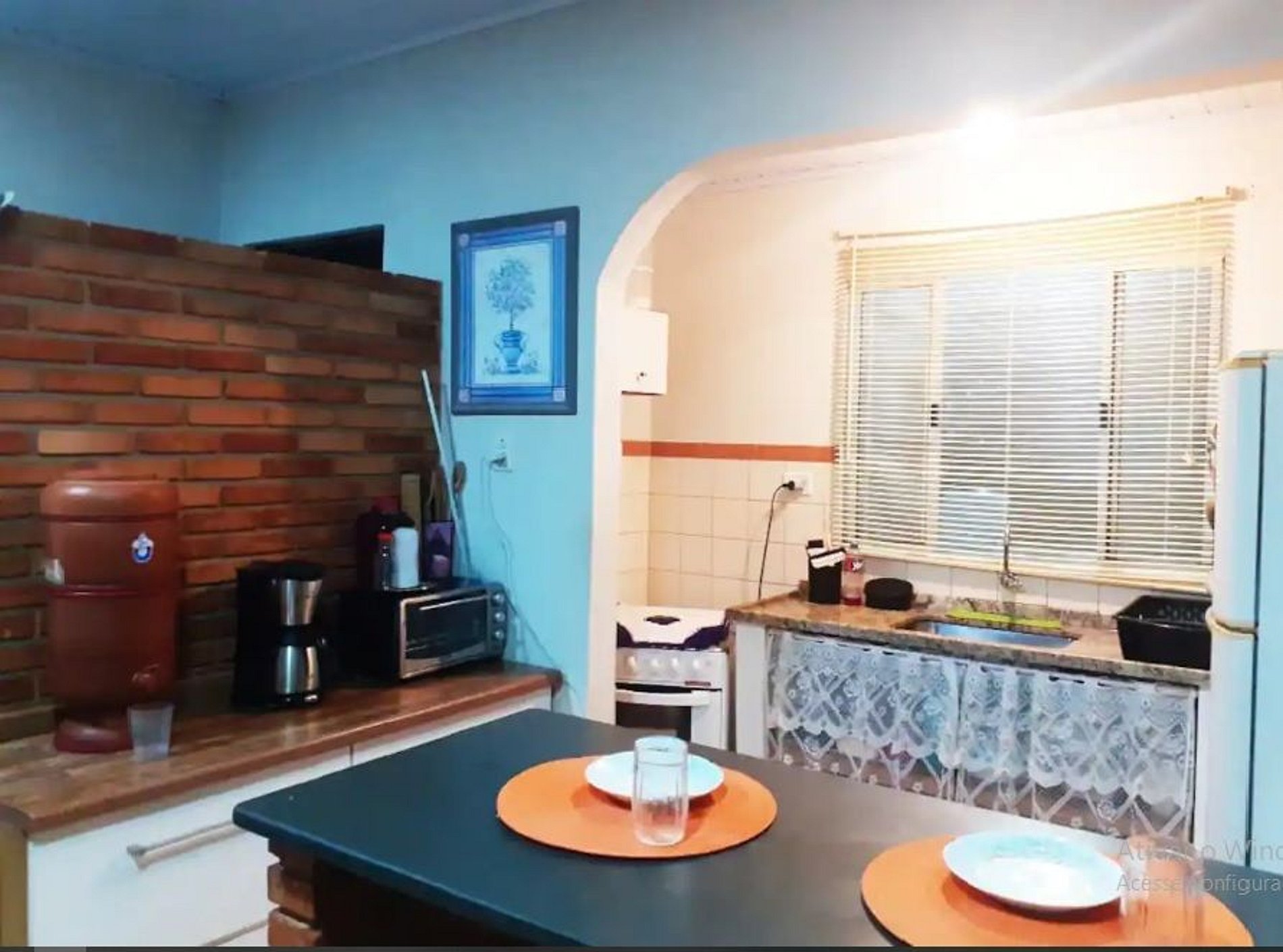 Sala de estar com TV e cozinha conjugada completa;
