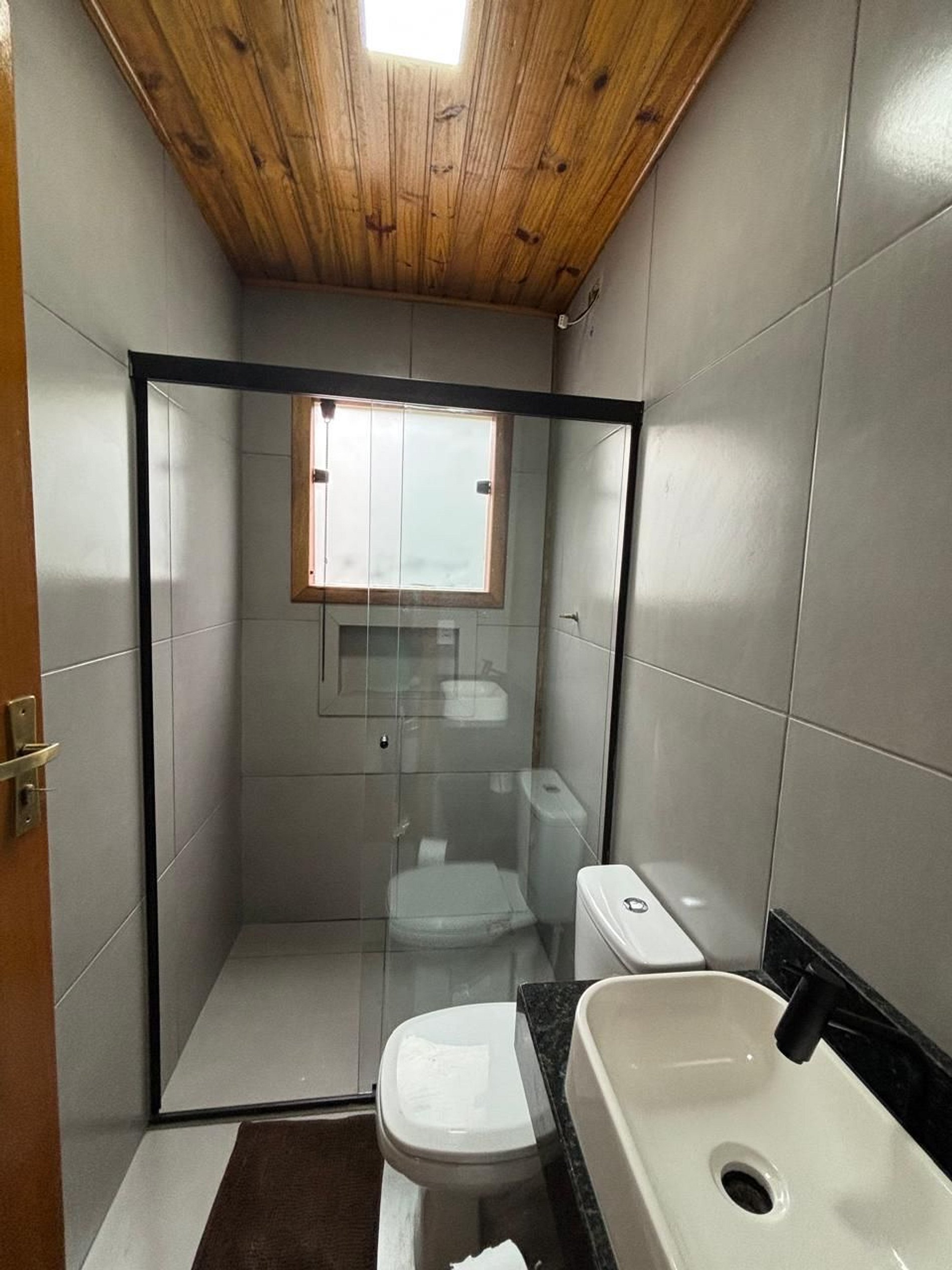 Vaga de um carro para cada chalé, chuveiros externos completam a área comum.
