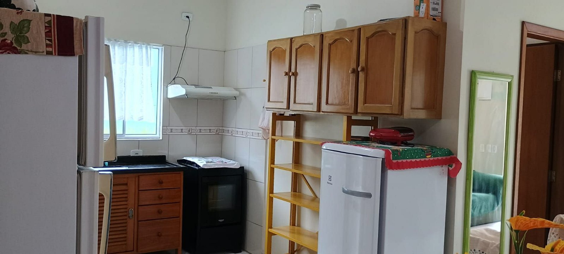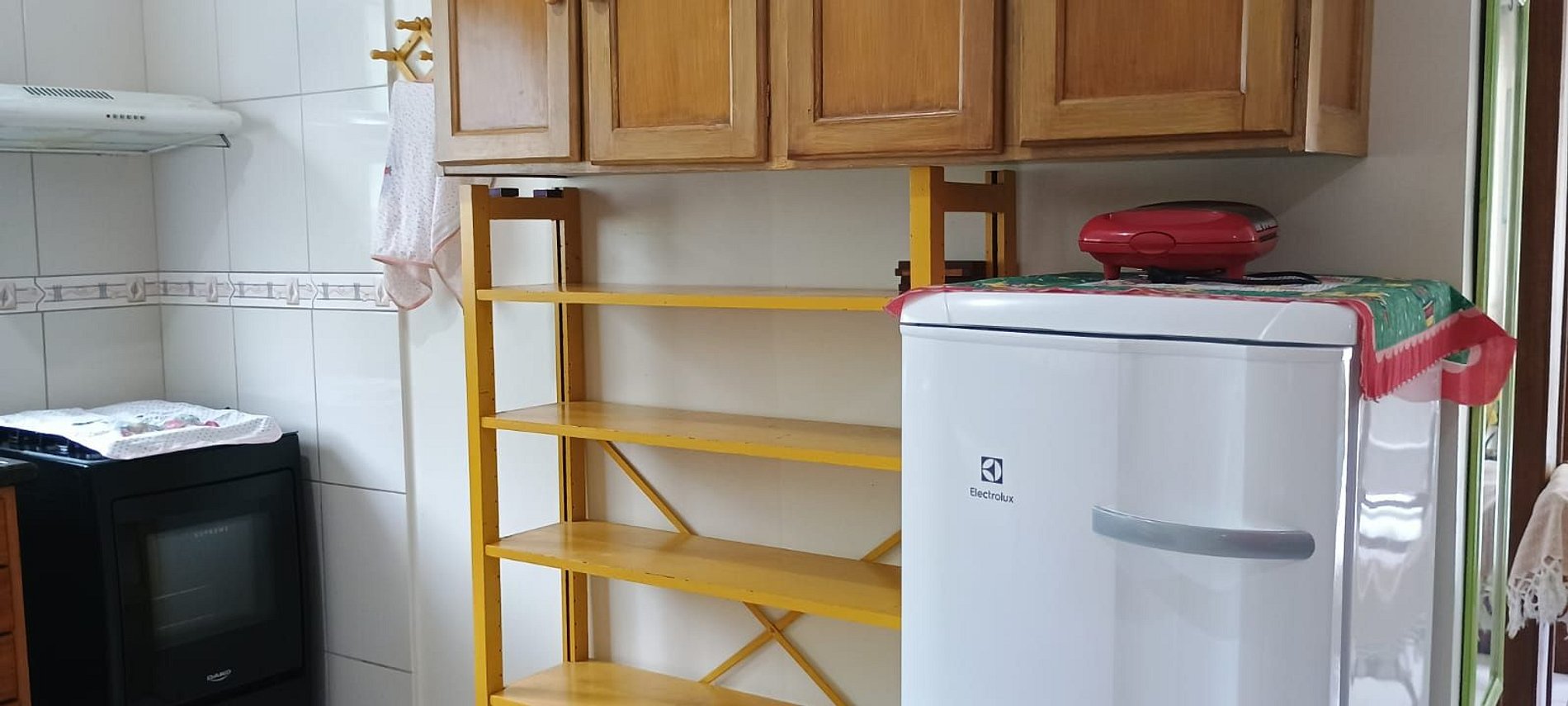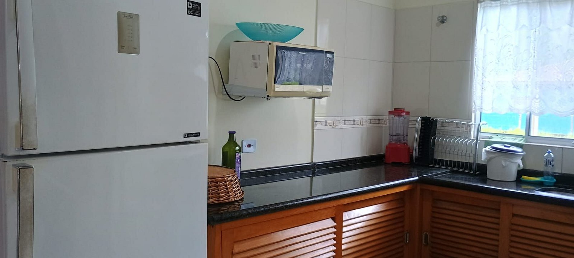 Cozinha: micro-ondas, grill, liquidificador, panelas, pratos, talheres e utensílios, geladeira, fogão, freezer vertical;